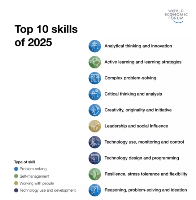 When researching academic skills for learning success I remembered a LinkedIn post one of my colleagues recently shared (figure 1). According to the World Economic Forum’s “Top 10 skills of 2025” the jobs of tomorrow will require problem solving, self-management, working with people, and technology use and development skills. Seeing these competencies made me think about how important it is for us to capitalize on the opportunities presented by the pivot to online learning. It left me wondering more about how these skills could be further cultivated by a radical rethinking of our core beliefs about teaching and learning and need for drastic systemic change in post-secondary education.